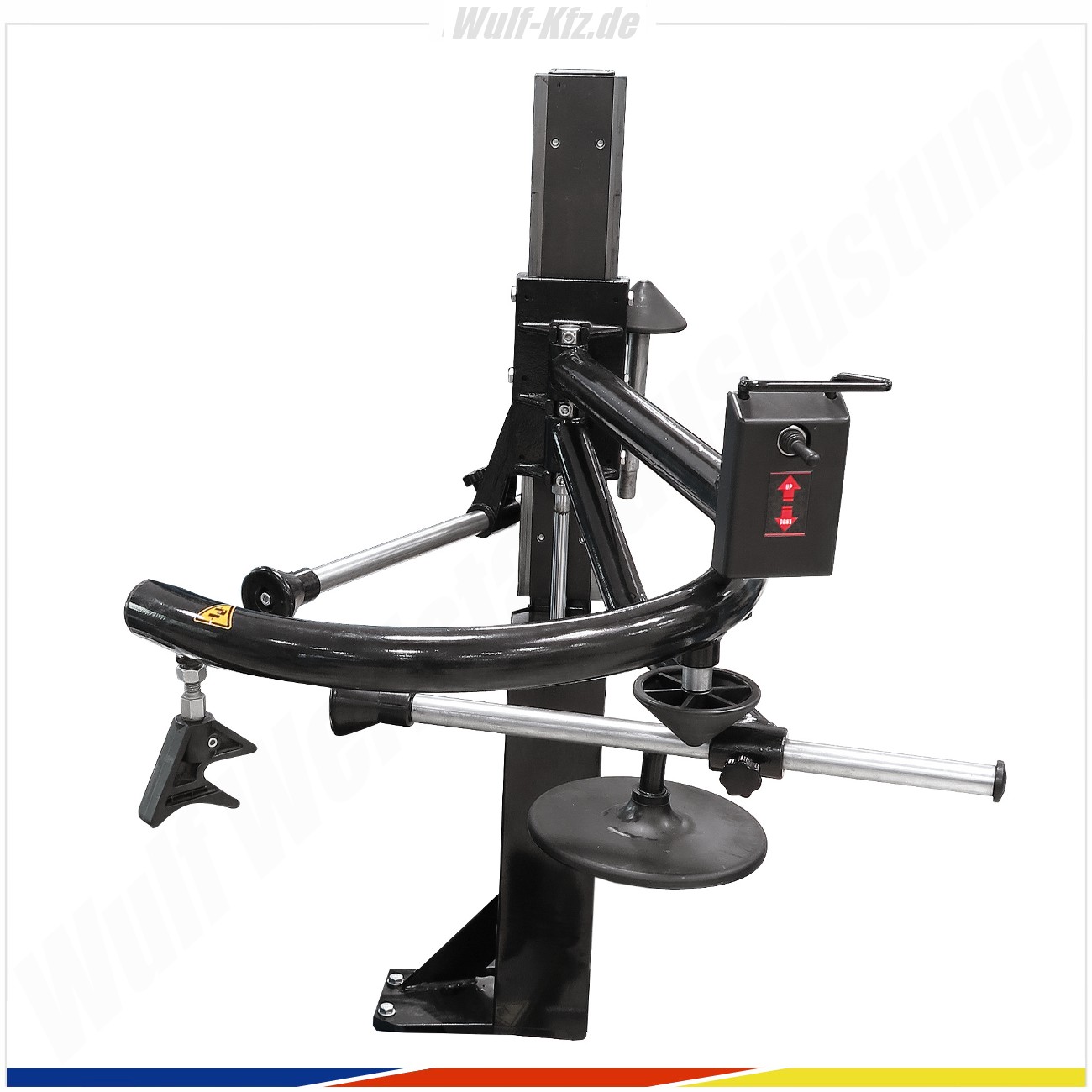 Der pneumatische Hilfsarm erleichtert die Montage und Demontage von Reifen, insbesondere bei großen Rad/Reifenkombinationen, Niederquerschnitts-, Hartflanken- und Run- Flat- Räder. Durch die Fixierung der Felge in der Mitte, wird die Felge fest auf die Spannklauen gedrückt und somit ist ein sicheres und problemloses Spannen gewährleistet.