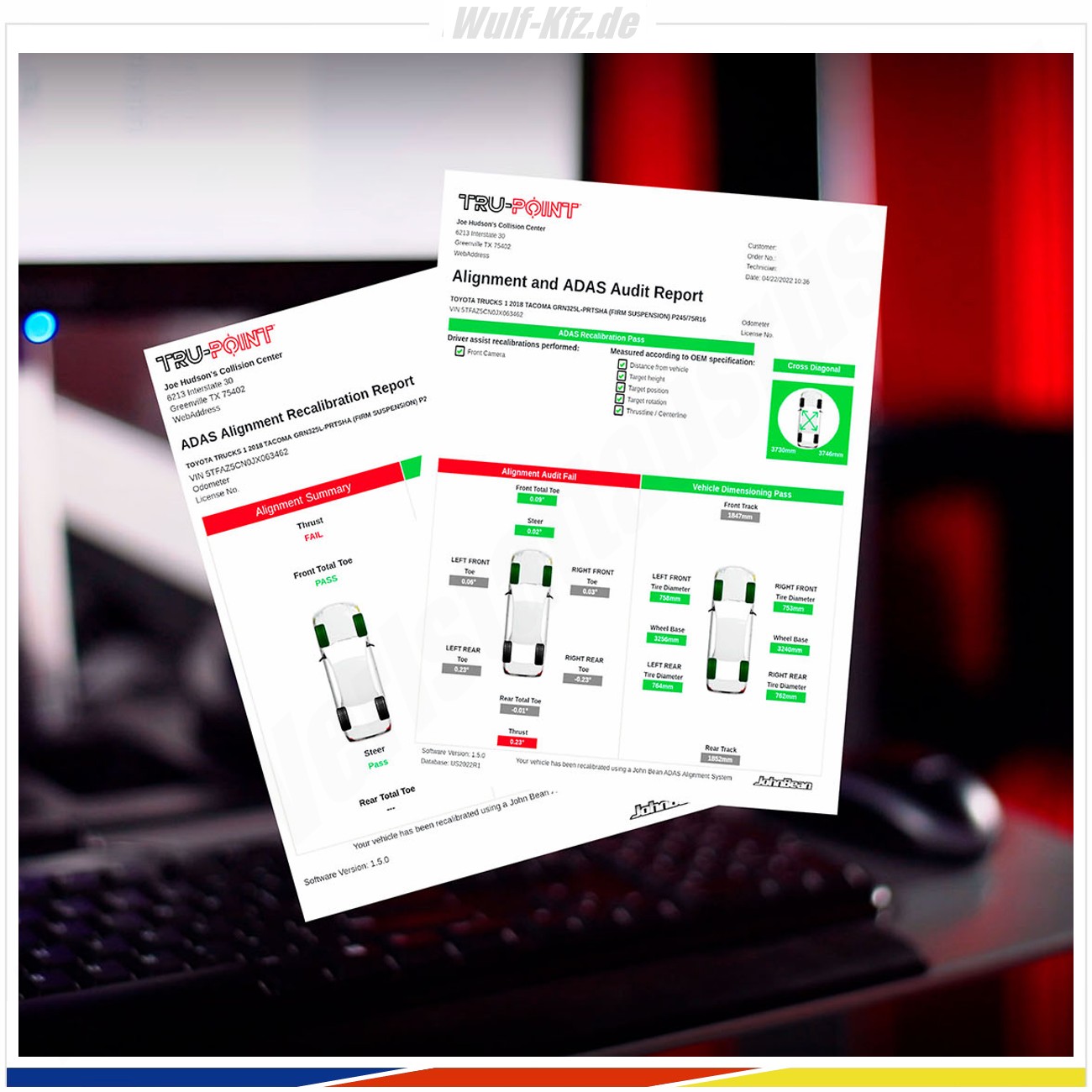 - Tru-Point bewertet die Achs- bzw. Fahrwerksdaten des Fahrzeugs, die Platzierung der Kalibriertafeln und die Übereinstimmung mit Herstellervorgaben.