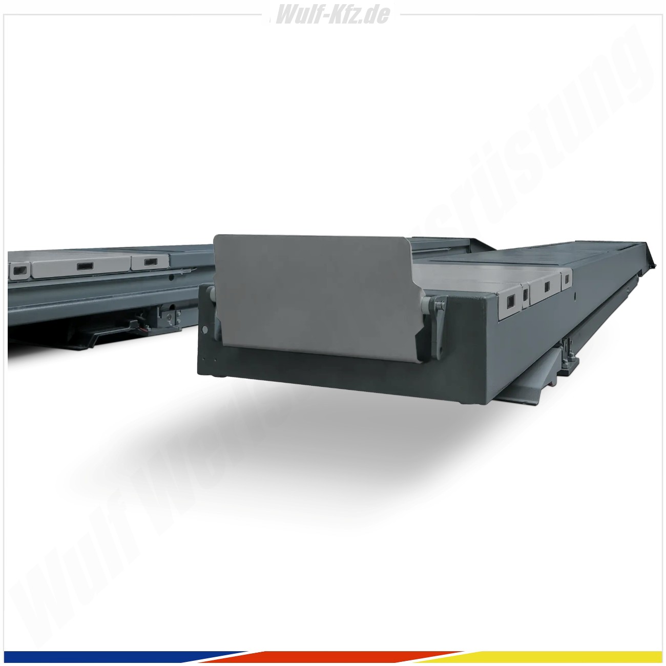 Fahrschienen für Achsvermessung: Präzisionsgefertigte Fahrschienen mit vorderen Aussparungen für Drehteller und integrierten hinteren Schiebeplatten ermöglichen exakte Achsvermessungen. Die Schiebeplatten mit pneumatischer Arretierung sorgen für maximale Genauigkeit und einfache Handhabung bei allen Vermessungsarbeiten. Der elektrohydraulische, in die Fahrschienen integrierte Radfreiheber verfügt über verstellbare Aufnahmepunkte und eine hydraulisch synchronisierte Hubbewegung – für höchste Präzision und Effizienz beim Anheben einzelner Achsen. Damit eignet sich die Bühne ideal für moderne Achsvermessungs- und Serviceplätze.
