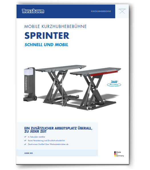 Die Sprinter Mobil 3500 kann mit dem Mobil-Set in Sekundenschnelle von einem Anwender ohne mechanische Hilfe bewegt werden und ist ohne verankert werden zu müssen sofort betriebsbereit. Mit ihren schnellen Hubzeiten, dem geringen Platzbedarf, dem 360° Zugang zum Fahrzeug, den längenverstellbaren Aufnahmen und der flachen Bauweise findet sie in jeder Kfz-Werkstatt ihren Platz.