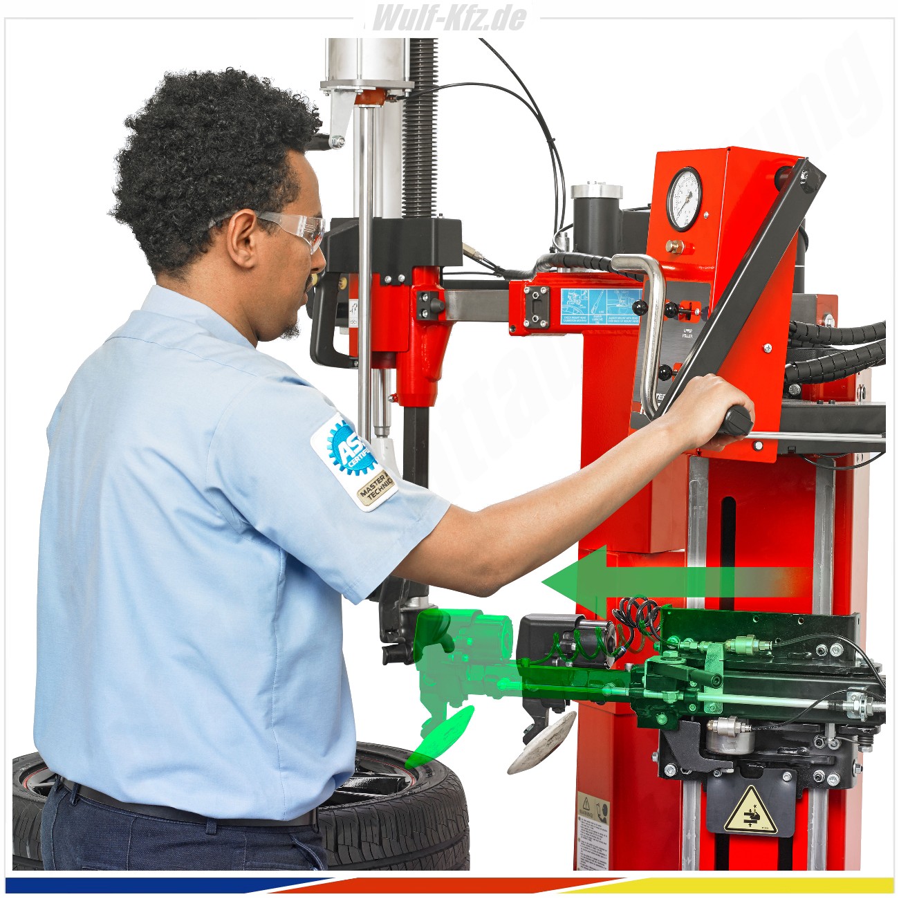 - Schwenkbarer Werkzeugarm: Montagekopf schwenkt automatisch aus dem Arbeitsbereich, platzsparend
