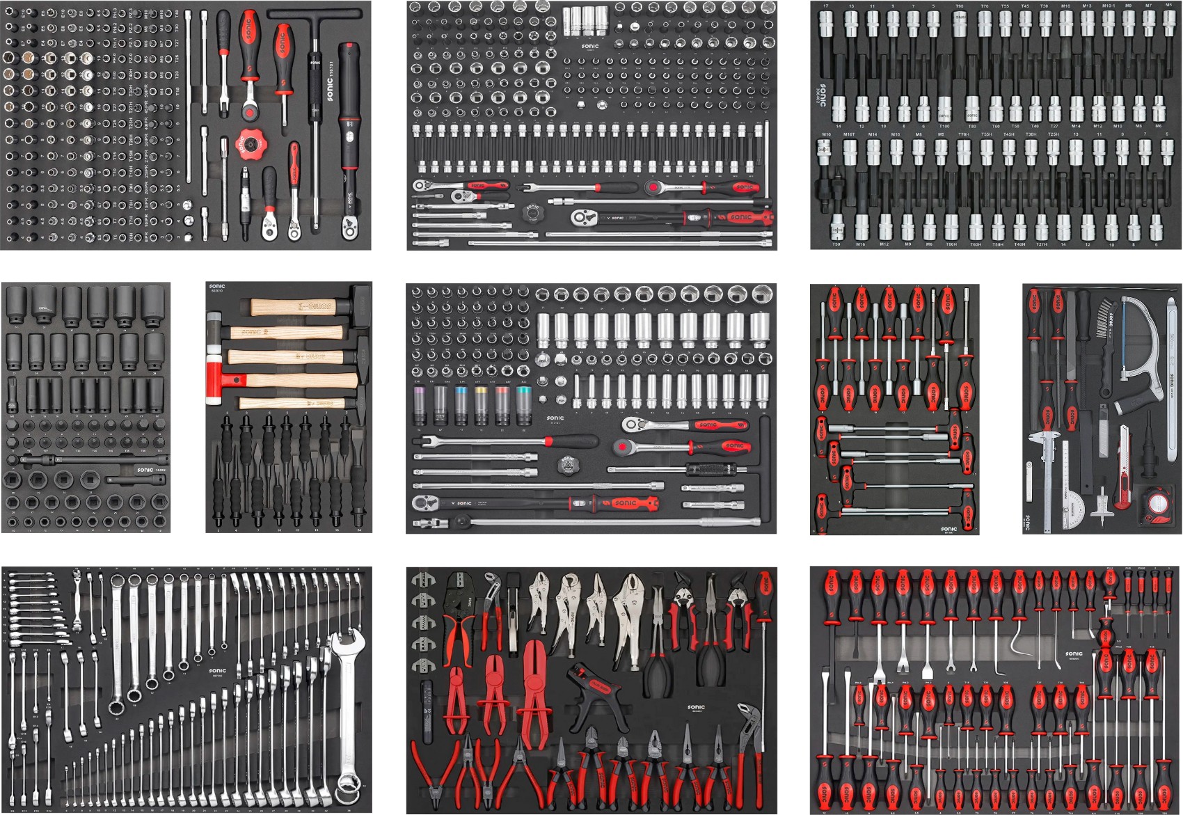 Der enthaltene 887-teilige Premium-Werkzeugsatz deckt nahezu alle Anwendungen in Kfz-Werkstätten, Industrie, Nutzfahrzeugservice und Motorsport ab: Stecknüsse, Bits, Schlagwerkzeuge, Schraubendreher, Zangen, Hammer, Meißel und Schraubenschlüssel sind perfekt organisiert und jederzeit einsatzbereit.