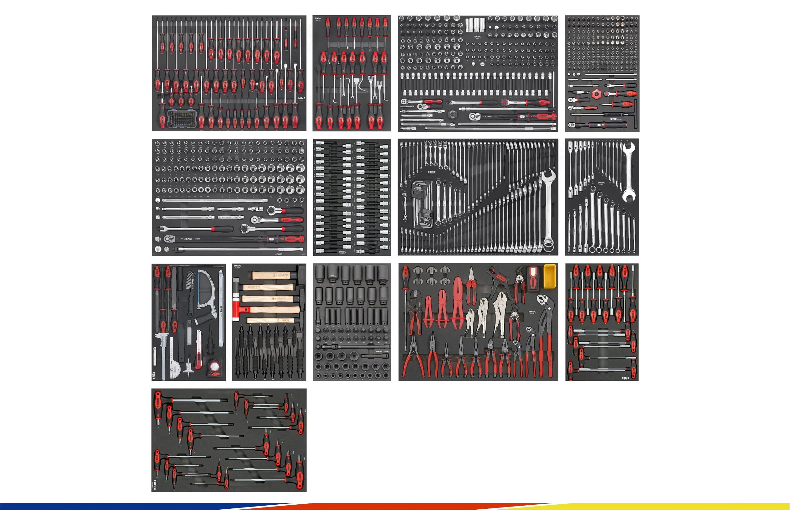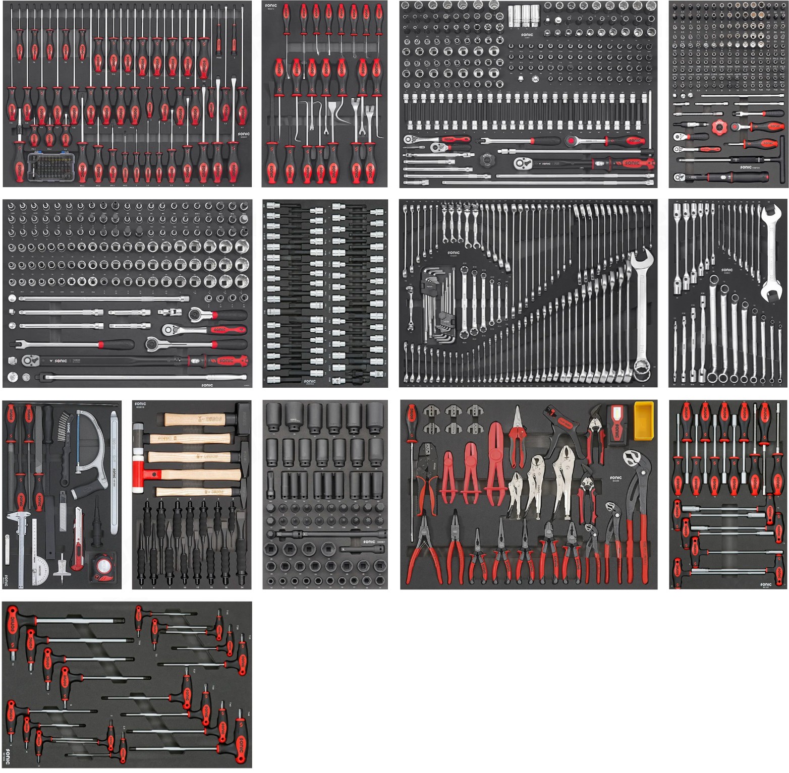 Der enthaltene 1.045-teilige Qualitäts-Werkzeugsatz deckt nahezu alle Anwendungen in Kfz-Werkstätten, Industrie, Servicebetrieben und Motorsport ab – von Steckschlüsseln, Bits, Schraubendrehern und Zangen bis hin zu Spezial- und Schlagwerkzeugen.