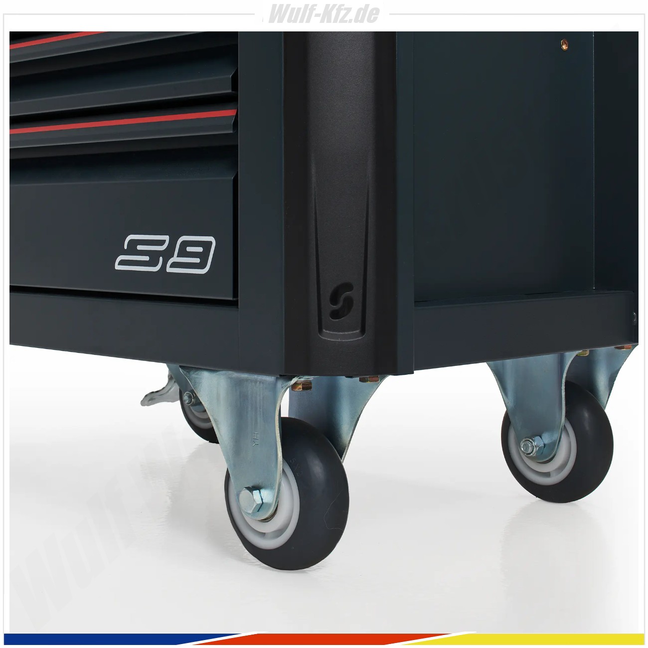 Acht hochwertige Premium-Schubladen – sieben flach und eine tief – nehmen den kompletten Werkzeugsatz sicher auf. Die Schubladen laufen auf belastbaren Schienen mit bis zu 60 kg Tragkraft in flachen und 120 kg in tiefen Schubladen. Das integrierte Schubladenblockiersystem schützt zuverlässig vor Kippen und sorgt für maximale Sicherheit bei voller Beladung.