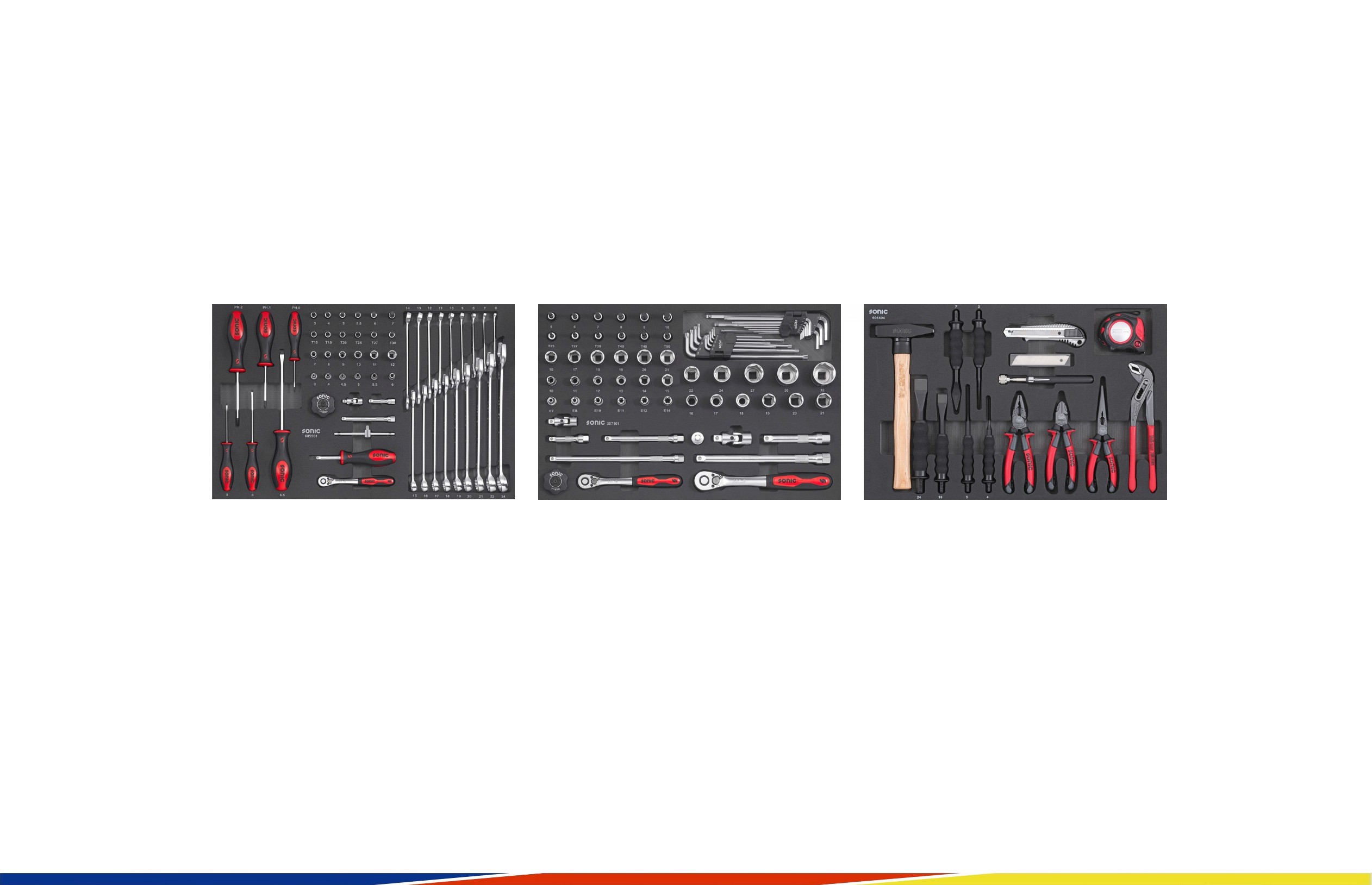 Im oberen Bereich befindet sich ein abschließbares Staufach für Materialien und Zubehör. Darunter sorgen drei großzügige, abschließbare Schubladen für perfekte Ordnung. Dank der Kompatibilität mit dem Sonic Foam System ist jedes Werkzeug sicher fixiert, übersichtlich angeordnet und sofort griffbereit.